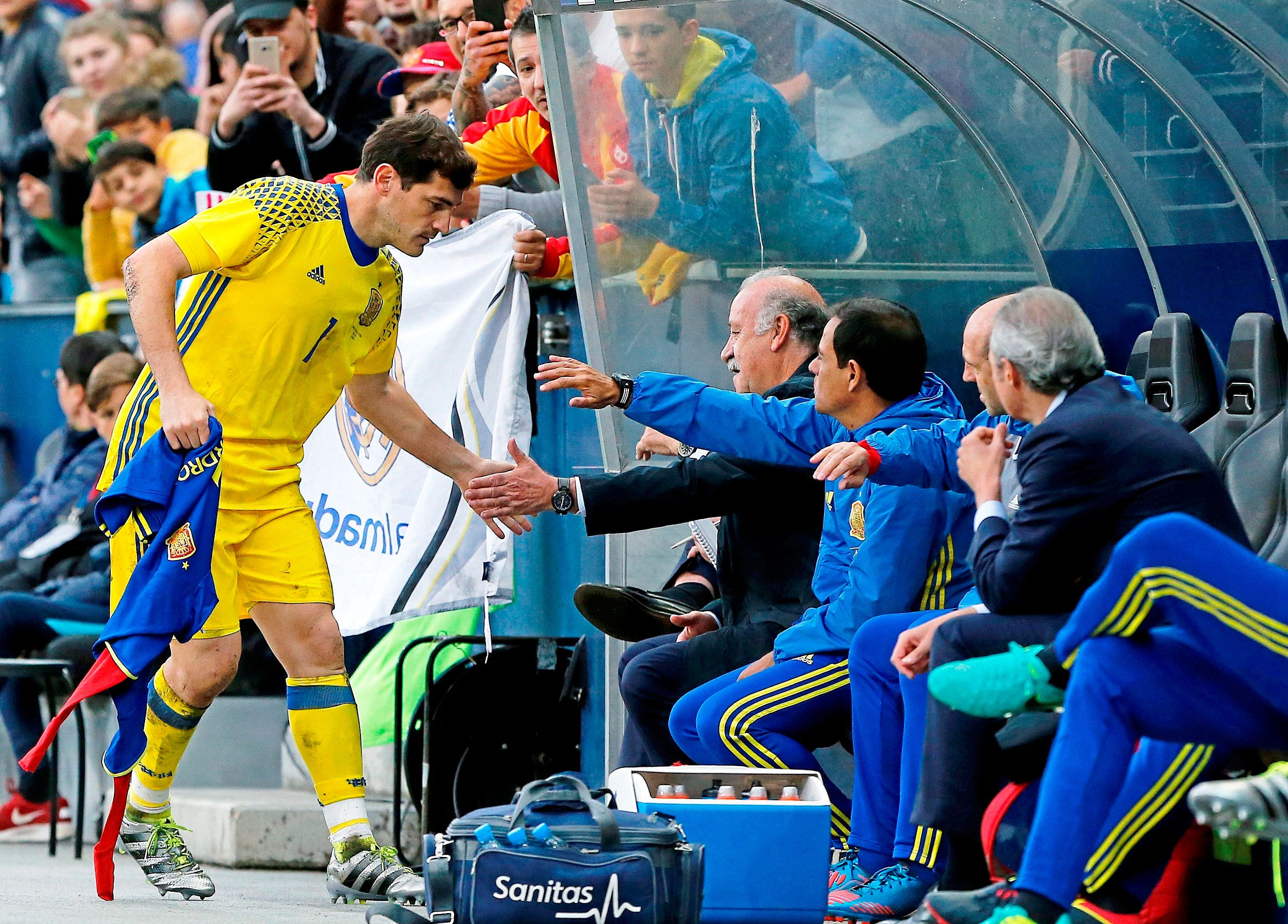 Ο Ίκερ Κασίγιας μόλις έχει γίνει αλλαγή στο φιλικό παιχνίδι της Ισπανίας με τη Νότια Κορέα την 1η Ιουνίου του 2016 στην Αυστρία. Ήταν η 167η και τελευταία συμμετοχή του Ισπανού στην Εθνική.