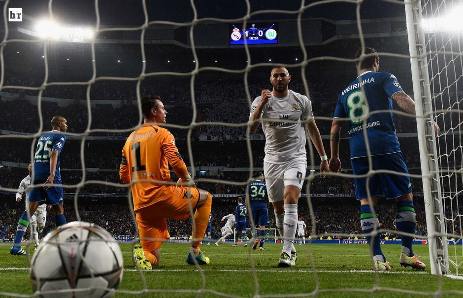 (Ο Μπενζεμά πανηγυρίζει το γκολ του Κριστιάνο απέναντι στη Βόλφσμπουργκ στον προημιτελικό του Champions League στο Μπερναμπέου)