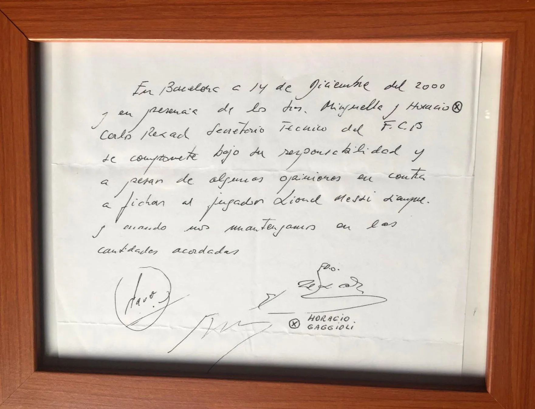 “Στη Βαρκελώνη, στις 14 Δεκεμβρίου του 2000 και παρουσία των κυρίων Μινγκέγια και Γκατσιόλι, ο Κάρλες Ρεσάκ, τεχνικός γραμματέας της Μπαρτσελόνα, δεσμεύεται υπ’ ευθύνη του και παρά το γεγονός ότι υπάρχουν κάποιες αντίθετες γνώμες, να προσφέρει συμβόλαιο στον παίκτη Λιονέλ Μέσι, πάντα και εφόσον τηρηθούν τα συμφωνημένα ποσά”. Από κάτω υπέγραψαν οι Ρεσάκ, Μινγκέγια και Γκατσιόλι. Μια εβδομάδα αργότερα, το περιεχόμενο της χαρτοπετσέτας αναγνωρίστηκε επίσημα σε συμβολαιογραφείο της Βαρκελώνης και έτσι ο Λέο άρχισε να ετοιμάζει τις βαλίτσες του για να εγκατασταθεί μόνιμα στη Μασία. Εδώ να πούμε ότι η ιστορική χαρτοπετσέτα βρίσκεται στην κατοχή του Οράσιο Γκατσιόλι, ο οποίος ζει σήμερα στην Ανδόρα και την έχει φυλαγμένη σε θυρίδα της τράπεζας Crédit Andorrá!