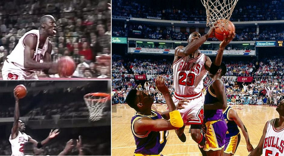 Ο Jordan απέφυγε τον προσωπικό φρουρό του με μια “πλαστική” προσποίηση, μπήκε στο ζωγραφιστό και απογειώθηκε για το – αναμενόμενο – κάρφωμα. Τη μπάλα την είχε στο δεξί του χέρι, όταν ο AC Green ορθώθηκε μπροστά του για να τον σταματήσει. Κάθε άλλος παίκτης θα είχε πασάρει ή θα προσπαθούσε να πάρει το φάουλ αναζητώντας την επαφή, έστω θα προσπαθούσε να περάσει τη μπάλα πάνω από το χέρι του αμυντικού και να δώσει καμπύλη στην τροχιά. Όχι όμως ο Jordan. Eν πτήση, πέρασε την μπάλα από το δεξί στο αριστερό, απέφυγε με μια απίστευτη κίνηση του σώματος τον AC Green που έμεινε έκπληκτος να απορεί κοιτώντας τον Air να αφήνει τη μπάλα στο καλάθι. Just perfect.