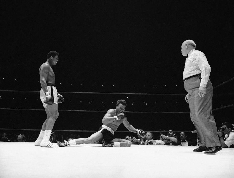 Heavyweight champion Muhammad Ali (Cassius Clay) at left stands by after he landed a right to the head of challenger Cleveland Williams which knocked him down for the fourth time in their title bout in Houston?s domed stadium on Nov. 15, 1966. The punch was landed in the third round and moment?s later referee Harry Kessler put a stop to the mismatch, awarding Ali a technical knockout. (AP Photo) ASSOCIATED PRESS
