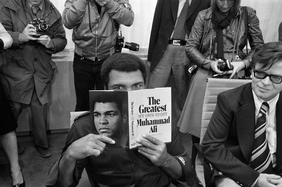 Muhammad Ali peers over a copy of his book "The Greatest," in the VIP room at the airport in Frankfurt, Oct. 10, 1975. Ali came to Frankfurt to introduce his book at the International Book Fair. (AP Photo/Kurt Strumpf) ASSOCIATED PRESS