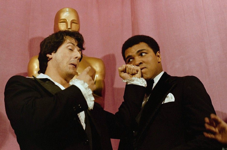 Actor Sylvester Stallone, star of "Rocky" and heavy weight champion Muhammad Ali clown around back stage after Oscar Awards show, March 28, 1977 in Los Angeles. (AP Photo) ASSOCIATED PRESS