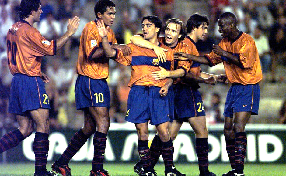 Ο Τσάβι έχει πετύχει το πρώτο του γκολ με την πρώτη ομάδα της Μπαρτσελόνα επί της Μαγιόρκα στον πρώτο τελικό του ισπανικού Σούπερ Καπ και δέχεται τα συγχαρητήρια των συμπαικτών του. Από αριστερά, Ναδάλ, Ζιοβάνι, Τσάβι, Ζέντεν, Ρουτζέ και Οκουνόβο (18/8/1998)