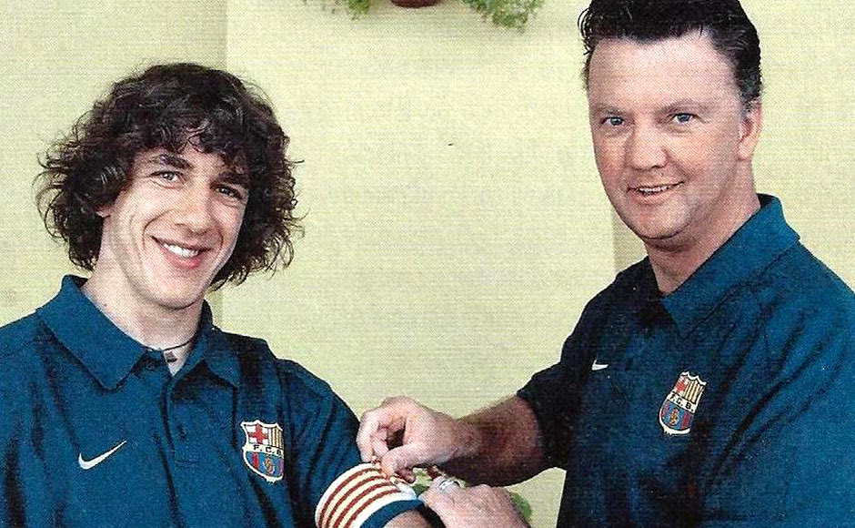 Ο Λουίς Φαν Χάαλ φοράει για πρώτη φορά το περιβραχιόνιο του αρχηγού στον Κάρλες Πουγιόλ στα φιλικά της προετοιμασίας της Μπαρτσελόνα το καλοκαίρι του 2002.