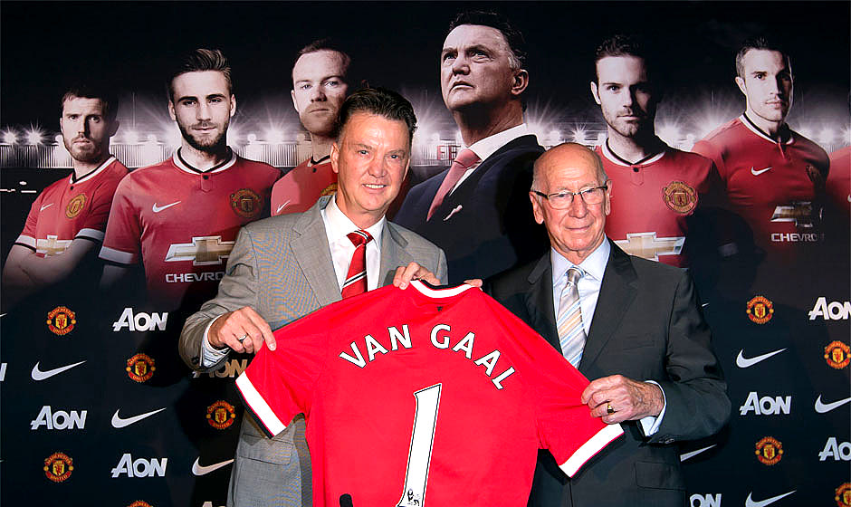 Λουίς Φαν Χάαλ και Μπόμπι Τσάρλτον στην επίσημη παρουσίαση του πρώτου ως νέου προπονητή της Μάντσεστερ Γιουνάιτεντ τον Ιούλιο του 2014 (AP Photo/Jon Super)