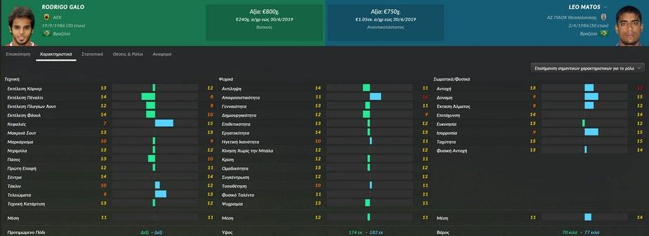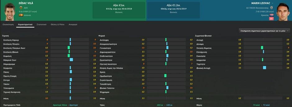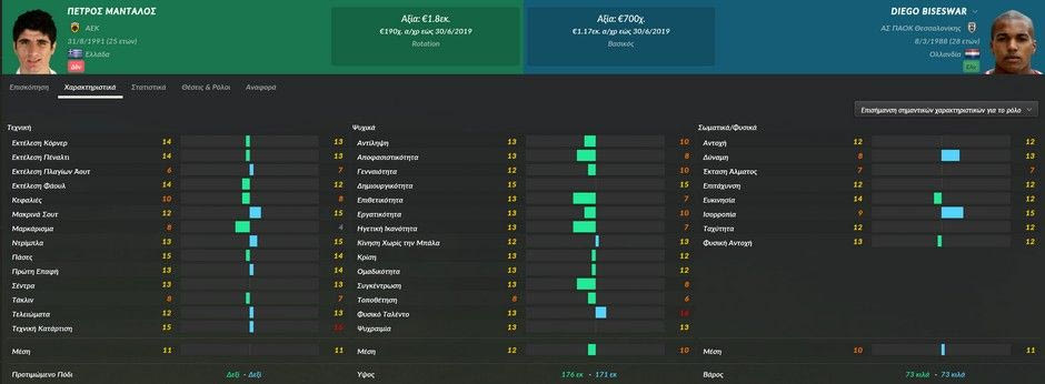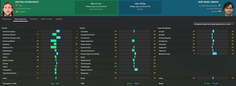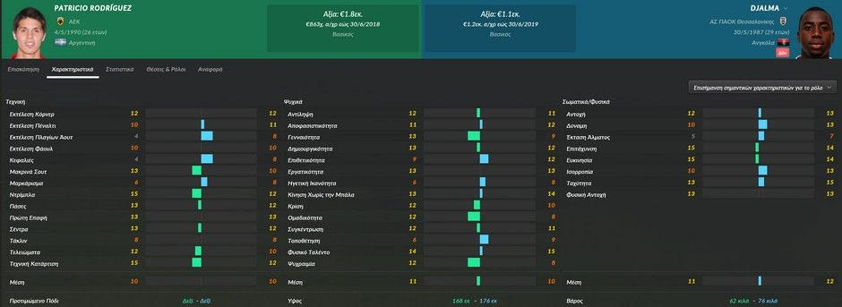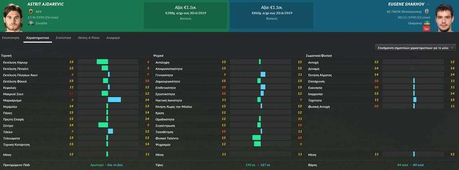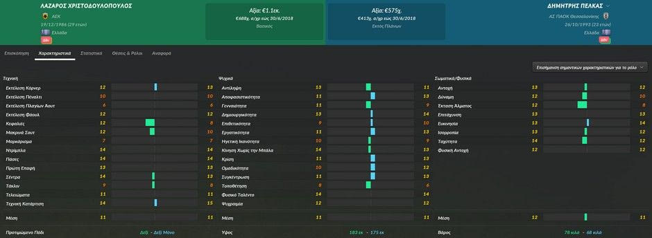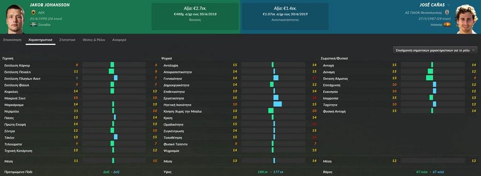 Οι δυο τους είναι από τους καλύτερους στον τομέα του τη δεδομένη στιγμή και πάντα σε επίπεδο Football Manager. Και μόνο που στον τομέα των ψυχικών χαρακτηριστικών το παιχνίδι κρίνεται στο 13-14 λέει πολλά. Αν και κερδίζει με 11-10, ο Σουηδός της ΑΕΚ έχει μεγαλύτερο βαθμό στα δέκα από τα τεχνικά χαρακτηριστικά. Και η απάντηση του Ισπανού; Έχει οκτώ καλύτερα χαρακτηριστικά στο ψυχικό κομμάτι. Στα σωματικά πηγαίνουμε στο 12-12.