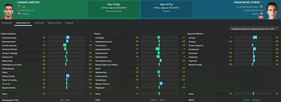 Στο σύνολο υπάρχει “ισοπαλία” στα κύρια χαρακτηριστικά του τερματοφύλακα, μια μικρή “νίκη” του Ανέστη στα ψυχικά χαρακτηριστικά και μια μικρή “νίκη” του Γλύκου στα σωματικά. Ο Ανέστης υπερτερεί σε τομείς όπως έκταση άλματος, επικοινωνία και μοίρασμα με τα χέρια, ο Γλύκος “απαντά” στην πρώτη επαφή και στη χαμηλή έξοδο. Στα ψυχικά χαρακτηριστικά, ο Ανέστης έχει “δικιά του” την αντίληψη, την αποφασιστικότητα, τη γενναιότητα, την επιθετικότητα και την εργατικότητα, με τον Γλύκο να είναι καλύτερος στην ηγετική ικανότητα. Στα σωματικά, ο Γλύκος κερδίζει στους περισσότερους τομείς πλην της έκτασης άλματος και της φυσικής αντοχής.