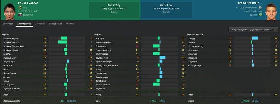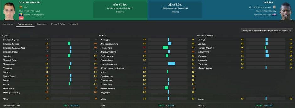 Η συγκεκριμένη μονομαχία μοιάζει με… “μια σου και μια μου”. Στο +2 ο Βράνιες στις κεφαλιές, στο +1 ο Βαρέλα στο μαρκάρισμα. Στο +1 ο Βράνιες στα τάκλιν, στο +1 ο Βαρέλα στην πρώτη επαφή και κάπως έτσι έρχεται το 9-9 στα τεχνικά χαρακτηριστικά. Στα ψυχικά, ο Βαρέλα είναι στο +1 στον μέσο όρο, με τους δυο παίκτες να έχουν από ένα σημείο στο οποίο “κατατροπώνουν” τον αντίπαλό τους. Ο Βράνιες είναι στο +5 στην γενναιότητα και ο Βαρέλα στο +7 στην ηγετική ικανότητα. Την ίδια στιγμή πηγαίνουν χέρι – χέρι σε εργατικότητα και κίνηση χωρίς την μπάλα. Στα σωματικά, ο Βαρέλα βρίσκεται στο +1 έχοντας καλύτερο βαθμό σε αντοχή, δύναμη, επιτάχυνση και ευκινησία.