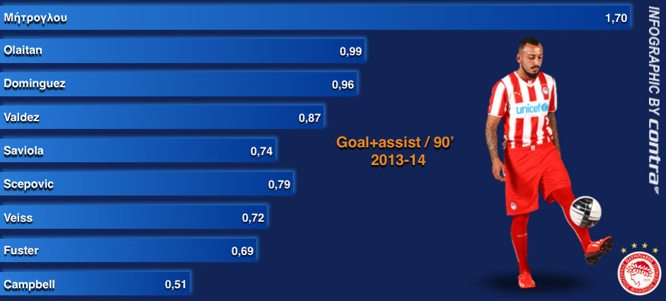 Ο φουλ επιθετικός και proactive Ολυμπιακός του Μίτσελ δεν έκανε αήττητη σεζόν. Είχε όμως μια εγχώρια σεζόν με παίκτες που έκαναν επιθετικά όργια. Πριν φύγει για την Αγγλία, ο Μήτρογλου είχε 14 γκολ (χωρίς πέναλτι) και 2 ασίστ σε μόλις 846’ και έσπασε τα κοντέρ με 1.70 γκολ+ασίστ ανά 90λεπτο. Αλλά δεν ήταν μόνο αυτός.