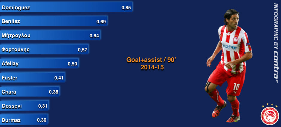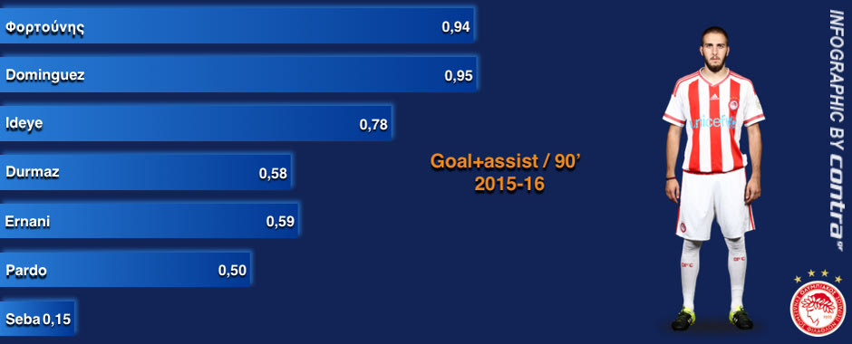 Εννέα παίκτες με πάνω από 0.50 γκολ+ασίστ ανά 90 λεπτά, που σημαίνει πως κάθε δύο παιχνίδια είχαν τουλάχιστον ένα γκολ ή μία ασίστ, χωρίς να υπολογίζονται τα πέναλτι. Κι όλα αυτά σε μια χρονιά που Μανιάτης-Σάμαρης τελείωσαν κι αυτοί με υψηλές επιδόσεις, αφού είχαν μαζί οκτώ γκολ και επτά ασίστ.