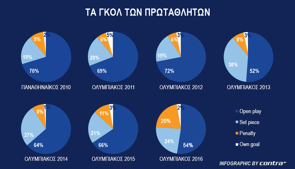 Ο φετινός Ολυμπιακός είναι στο πολύ χαμηλό 54% και έχει πάρει το πολύ υψηλό 20% των γκολ του απ’το σημείο του πέναλτι. Και, ω τι σύμπτωση, η μοναδική φορά που η πρωταθλήτρια ομάδα δυσκολευόταν τόσο πολύ να σκοράρει στο open play ήταν το 2012-13.