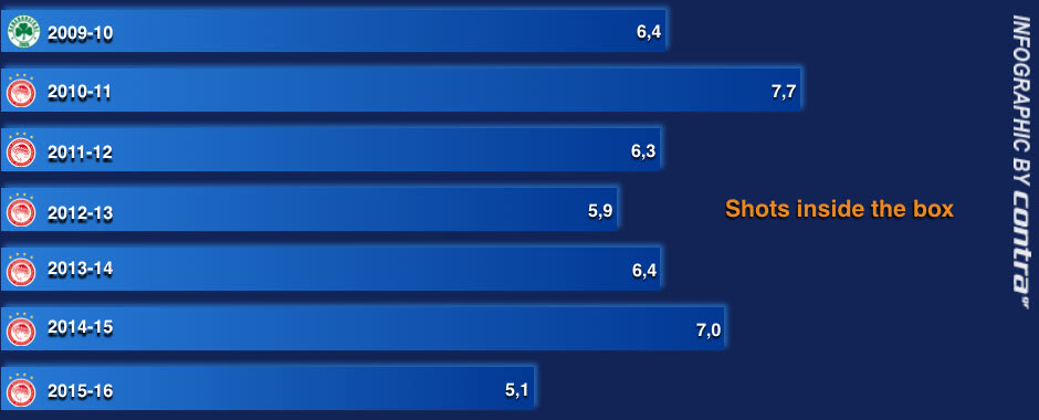 Και ο περσινός Ολυμπιακός σούταρε πολύ εκτός περιοχής, αλλά ταυτόχρονα είχε και επτά σουτ ανά αγώνα μέσα απ’το κουτί. Φέτος οι ερυθρόλευκοι έχουν μέσο όρο μόλις 5.1 σουτ μέσα απ’την περιοχή, επίδοση χειρότερη και απ’το 5.9 της χρονιάς Ζαρντίμ. Το 7.7 της πρώτης χρονιάς του Βαλβέρδε φαντάζει μάλλον αξεπέραστο.