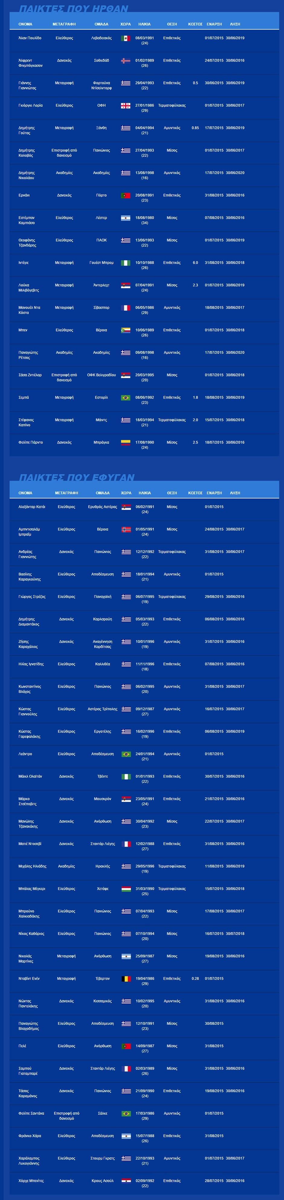 Στα θετικά του μεταγραφικού σχεδιασμού θα πρέπει να προσθέσουμε, επίσης ότι αποκτήθηκαν στη συντριπτική τους πλειοψηφία όλοι οι παίκτες που ζήτησε ο προπονητής. Σε αυτή την κατηγορία ανήκουν ο Πορτογάλος Ντα Σίλβα για την άμυνα, καθώς και οι τρεις ακραίοι επιθετικοί Πάρντο, Ερνάνι και Σεμπά, καθώς και ο Ιντέγε για την επίθεση. Μπορεί κάποιοι από αυτούς να μην έχουν αποδώσει ακόμη τα αναμενόμενα (ο Κολομβιανός Πάρντο έδειξε πολύ καλά δείγματα στην διάρκεια της προετοιμασίας), ωστόσο, από τη στιγμή που ο κόουτς τους ζήτησε και τους έχει, ξέρει και τον τρόπο που θα τους αξιοποιήσει μελλοντικά.
