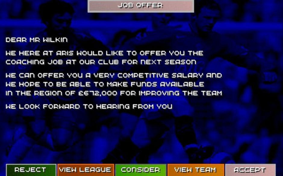 Όσον αφορά την επιλογή “JOB OFFERS”, κάθε φορά που αναβοσβήνει δίνει μια μικρή ώθηση στη ματαιοδοξία σου, αφού αν την επιλέξεις εμφανίζει τις ομάδες που σου έχουν κάνει πρόταση για να σου προσφέρουν μια θέση στον πάγκο τους. Μεταξύ άλλων, στις προτάσεις αναφέρεται το γεγονός πως θα σου δώσουν έναν παχυλό μισθό, ενώ χρησιμοποιούν σαν “τυράκι” για να σε πείσουν το ποσό που θα σου δώσουν για μεταγραφές αν κάνεις αποδεκτή την πρότασή τους. Συνήθως δεν πατάω “reject/accept” στις προτάσεις, τις οποίες αφήνω σε εκκρεμότητα ως το τέλος της σεζόν για να τις χαζέψω αυτάρεσκα μαζεμένες. Δεν ισχύει κάτι τέτοιο με πρόταση για τον πάγκο κάποιας εθνική ομάδας, η οποία όποτε μου είχε γίνει στο παρελθόν, τη συνόδευσα με τους κατάλληλους χορευτικούς πανηγυρισμούς μέσα στο δωμάτιο και με άμεση αποδοχή της.