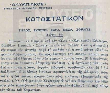 “Συνίσταται εν Πειραιεί υπό τον τίτλον “Ολυμπιακός Σύνδεσμος Φιλάθλων Πειραιώς” σωματείον, ούτινος σκοπός είναι η ανάπτυξις της σωματικής αγωγής παρά τη νεολαία και η κατά πάντα φίλαθλον τρόπον εξύψωσις αυτής”, ανέφερε το σχετικό καταστατικό και η ίδρυση του Ολυμπιακού Συνδέσμου Φιλάθλων Πειραιώς από μια παρέα επιφανών κατοίκων του Λιμανιού που βρέθηκαν στο ίδιο τραπέζι είναι γεγονός. Κανείς τους φυσικά δεν μπορούσε να προβλέψει την εξέλιξη του νεοσύστατου αυτού συλλόγου.