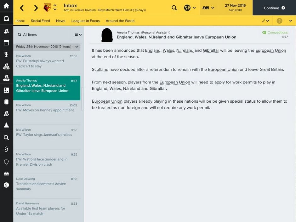 Το Football Manager δε θα μπορούσε να αγνοήσει την επίδραση των social media και στο ποδόσφαιρο, και πλέον υπάρχει ένα “in game twitter” στο οποίο μπορείς να παρακολουθείς όλα όσα λέγονται ανάμεσα σε παίκτες, ομάδες, δημοσιογράφους. Όλες οι φήμες είναι πλέον εκεί και μπορείς να τα παρακολουθείς για να μηΝ σου ξεφεύγει τίποτα. Και αυτή τη φορά, οι παίκτες είναι ακόμα πιο “δραστήριοι” και σε αυτό το τομέα. Ένας παίκτης που είναι δυσαρεστημένος, έχει πλέον…δημόσιο χώρο έκφρασης και θα πρέπει να τα βγάλεις πέρα όχι μόνο μαζί του αλλά και με τους δημοσιογράφους που θα σου κάνουν τη ζωή δύσκολη.