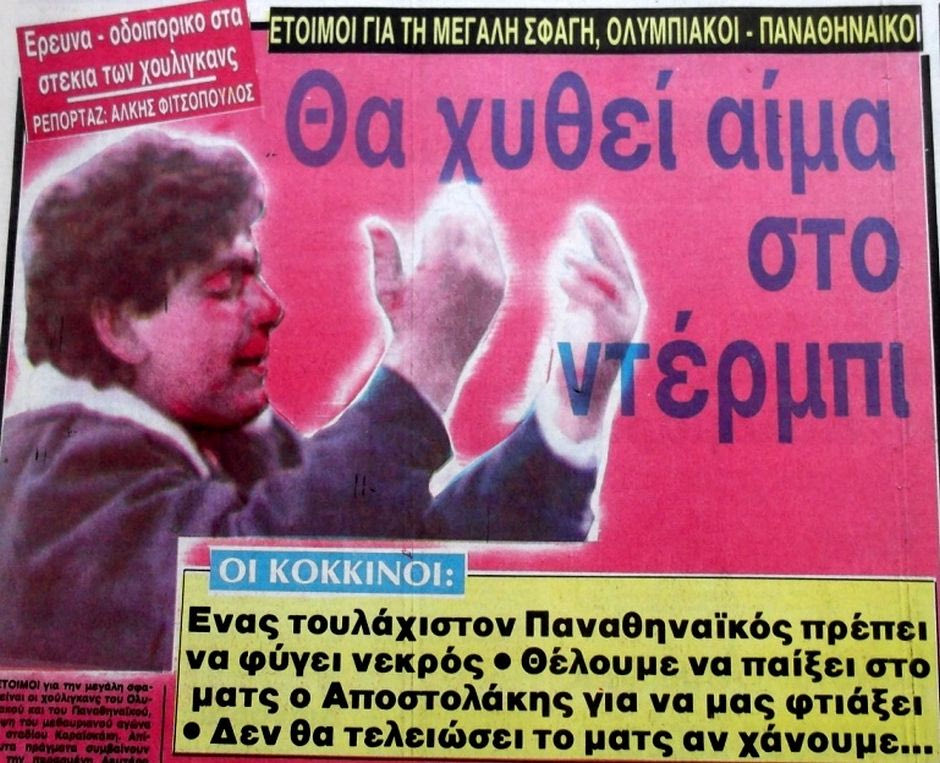 Ο Παναθηναϊκός όμως έχει ξεκινήσει ράθυμα το Πρωτάθλημα, κολλάει στο 1-1 στη Νίκαια με τον Ιωνικό και τρεις ημέρες αργότερα διαλύεται στο Πόζναν από την τοπική Λεχ, χάνοντας με 3-0. Ακολουθεί το σκάνδαλο με την αποχώρηση του ΠΑΟΚ του Θωμά Βουλινού από το ΟΑΚΑ και όλοι πνέουν μένεα κατά του «συστήματος» Βαρδινογιάννη στο ελληνικό ποδόσφαιρο. Ο Παναθηναϊκός αποκλείεται από τη Λεχ, η σεζόν μοιάζει χαμένη από το φθινόπωρο. Το ντέρμπι με τον Ολυμπιακό είναι η μεγάλη ευκαιρία για αντεπίθεση, το «παράθυρο» του Βαρδινογιάννη να συμμαζέψει τη διαγραφόμενη αποτυχημένη σεζόν. Υπολόγιζε όμως χωρίς τη μήνι των οπαδών του Ολυμπιακού για τον Αποστολάκη, ένα μίσος που εμπεριείχε όλο το μένος και εναντίον της ΕΠΟ, της ΕΠΑΕ, του Βαρδινογιάννη, του Σαλιαρέλη, του ίδιου του συστήματος. Διότι όσο δύσκολο κι αν είναι να το κατανοήσει κανείς, ο κόσμος του Ολυμπιακού – ειδικά την ομάδα του Μπλαχίν που πρωτάθλημα δεν κατέκτησε ποτέ – την ομάδα στα «πέτρινα χρόνια» τη λάτρευε όσο ποτέ.