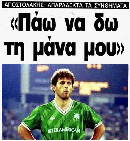 ‘Ωρα 19.05: Οι παίκτες του Παναθηναϊκού βγαίνουν με τις φόρμες τους από την καταπακτή, με πρώτο τον Αποστολάκη. Με ένα μαύρο μπουφάν και τα χέρια στις τσέπες, χειροκροτείται από περίπού 100 πράσινους οπαδούς που είναι ήδη στο πέταλο. Σε κλάσματα δευτερολέπτου η απάντηση από το απέναντι πέταλο αλλά κι από το χώρο των επισήμων. Χυδαία συνθήματα απ’ όλους: άνδρες, γυναίκες, παιδιά, γέρους. Ο Αποστολάκης δείχνει ατάραχος, κουβεντιάζει με το Γενικό Αρχηγό του Παναθηναϊκού Κώστα Μουρούζη, κουνά το κεφάλι του και ξαναμπαίνει στα αποδυτήρια. 19.40: Το γήπεδο σείεται από τα υβριστικά συνθήματα για τη μάνα του Αποστολάκη, περίπου 12 χιλιάδες κόσμος βγάζει τα σώψυχά του και τεντώνει τις φλέβες του σε βαθμό σκοτοδίνης. 8.00: Οι παίκτες του Παναθηναϊκού βγαίνουν από την καταπακτή για την καθιερωμένη προθέρμανση. Πέμπτος στη σειρά ο Αποστολάκης, με το 2 στην πλάτη, δέχεται απ’ όλο το γήπεδο ό,τι είχε ο καθένας επάνω του.