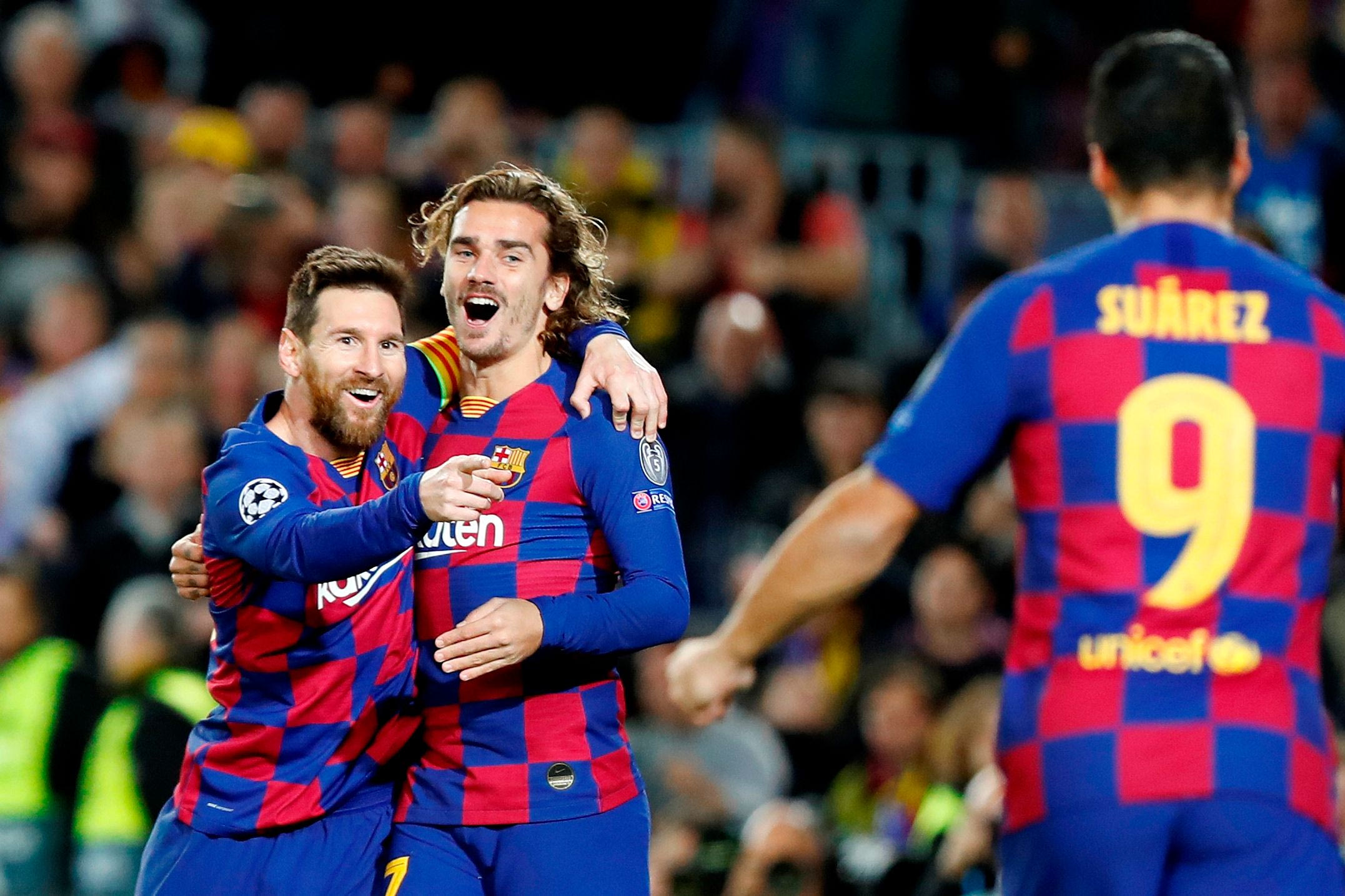 Μέσι και Γκριεζμάν πανηγυρίζουν αγκαλιασμένοι ένα γκολ της Μπαρτσελόνα μαζί με τον Σουάρες (27/11/2019). AP