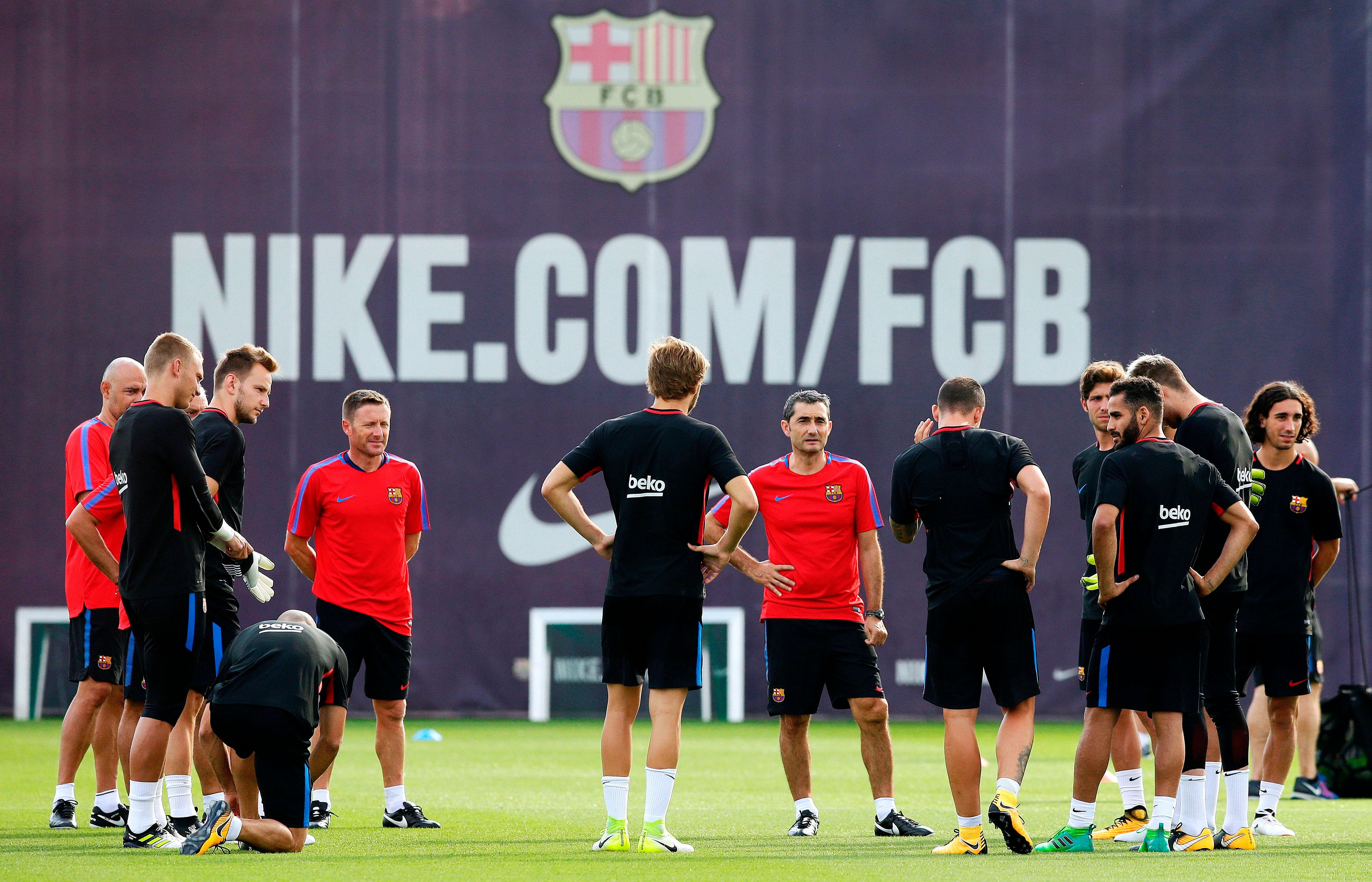 Ο Βαλβέρδε και οι παίκτες της Μπαρτσελόνα σε προπόνηση. AP