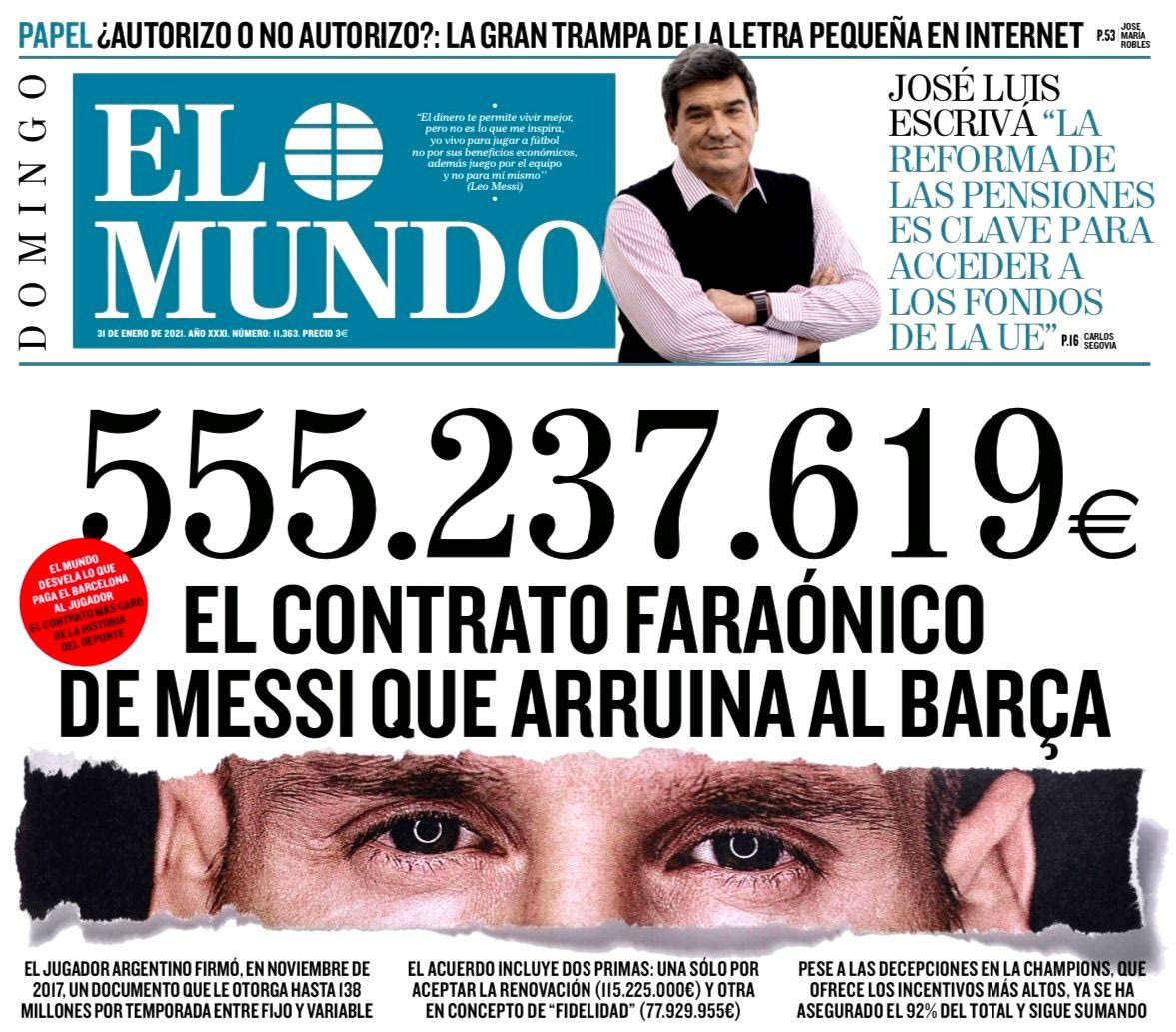 Το πρωτοσέλιδο της El Mundo στις 31 Ιανουαρίου με τίτλο: "Το φαραωνικό συμβόλαιο του Μέσι που χρεοκοπεί την Μπαρτσελόνα". elmundo.es