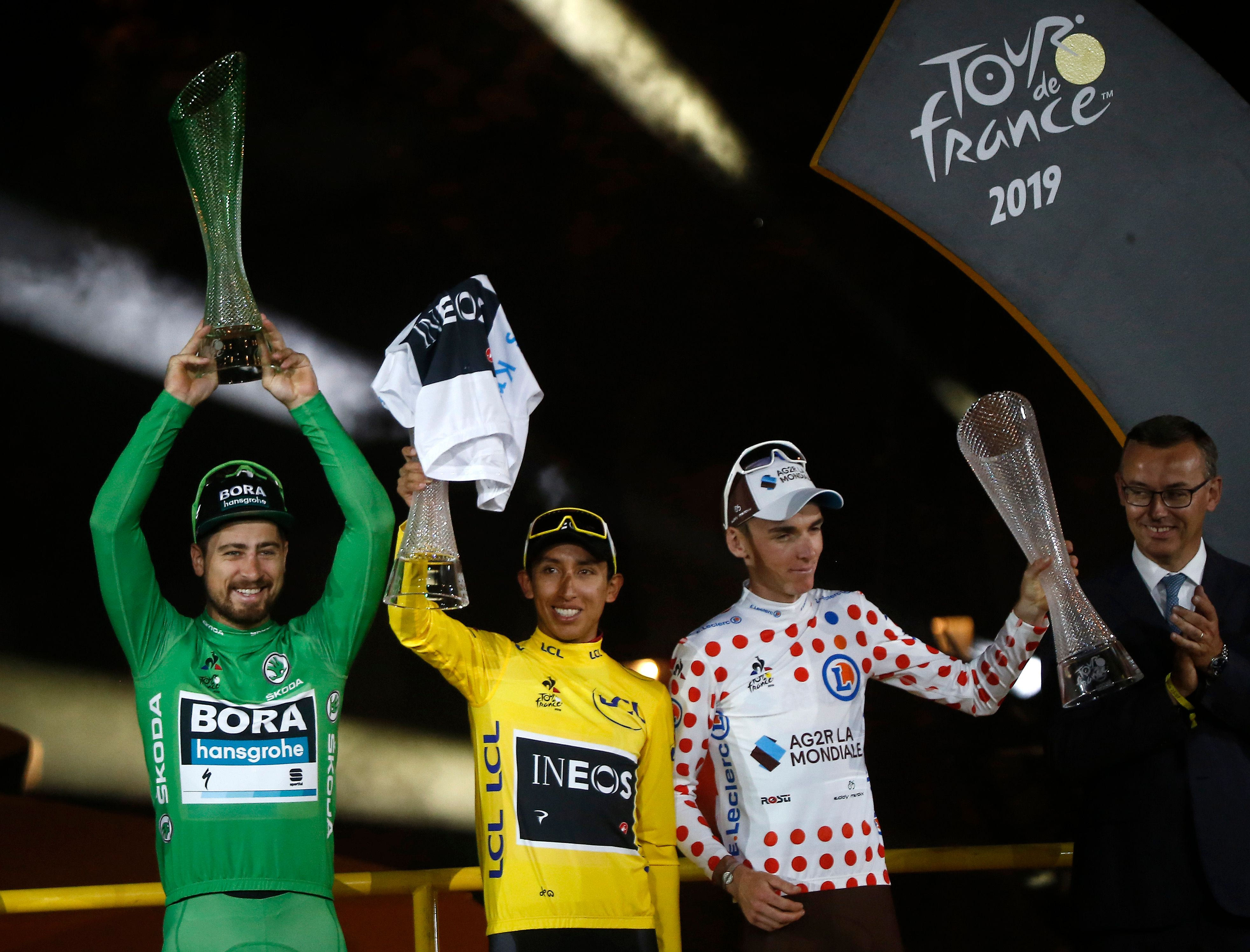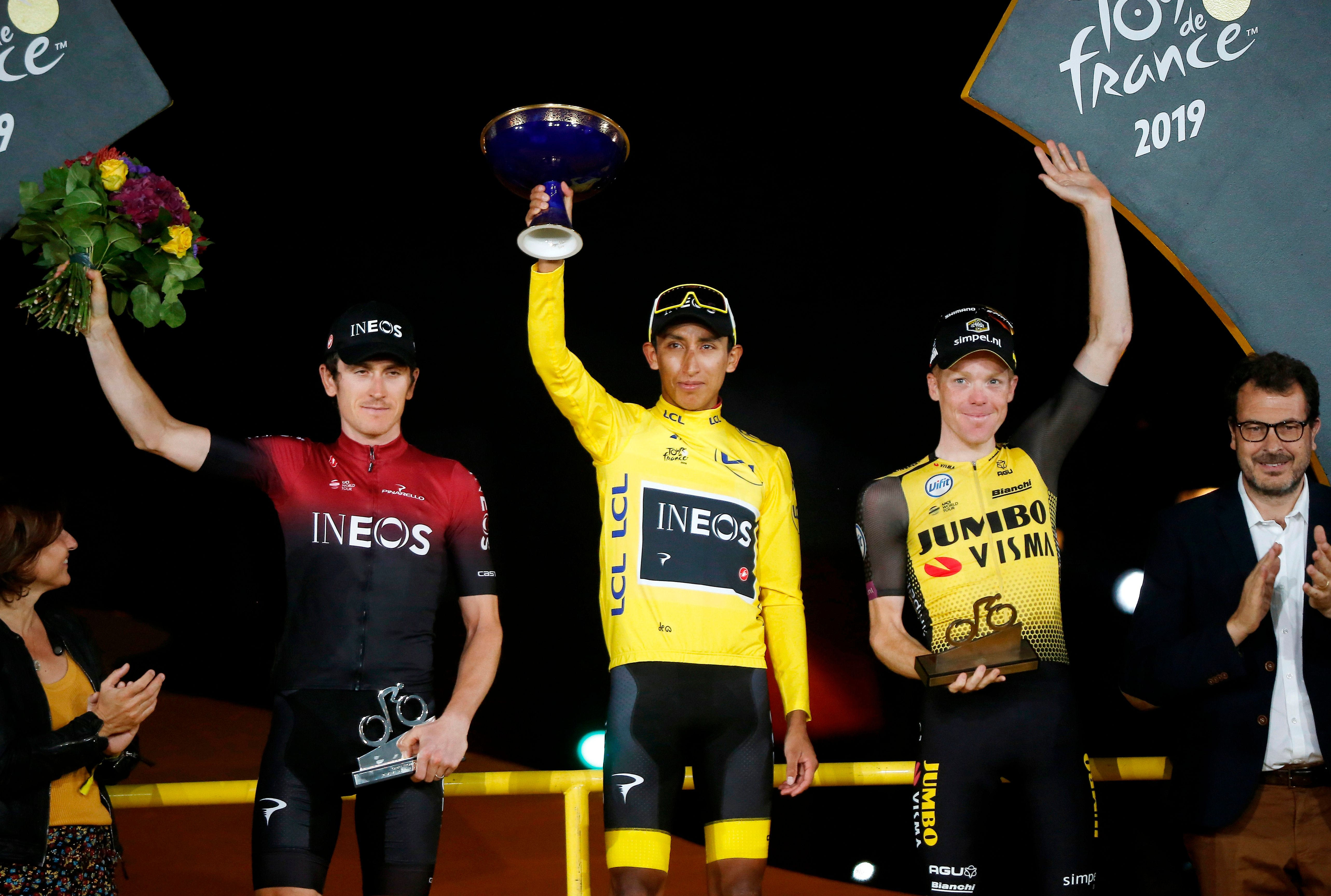 Το τελικό βάθρου του Tour 2019: Από αριστερά, Γκέρεντ Τόμας (δεύτερος), Έγαν Μπερνάλ (πρώτος), Στέιβεν Κράισβαϊκ (τρίτος). AP