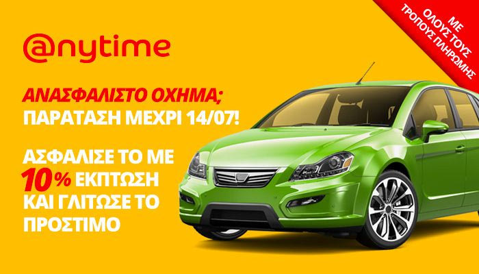 Ανασφάλιστο όχημα; Anytime ασφάλεια αυτοκινήτου με 10% έκπτωση, σε κάθε τρόπο πληρωμής!