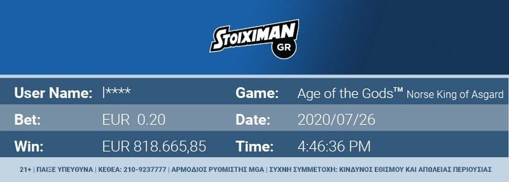 Έχοντας αφήσει ένα υπόλοιπο 4 ευρώ, αποφάσισε να μπει και στο Casino της Stoiximan για να παίξει για πρώτη φορά σε Jackpot Slots. Συνηθίζει να παίζει στη Stoiximan από την εφαρμογή του κινητού, απολαμβάνοντας όλες τις δυνατότητες της κορυφαίας εταιρείας* για Στοίχημα και Καζίνο από κινητό, αποφασίζοντας αυτή τη φορά να δοκιμάσει τα φρουτάκια Jackpot και συγκεκριμένα το “Age of the Gods Norse King of Asgard”.