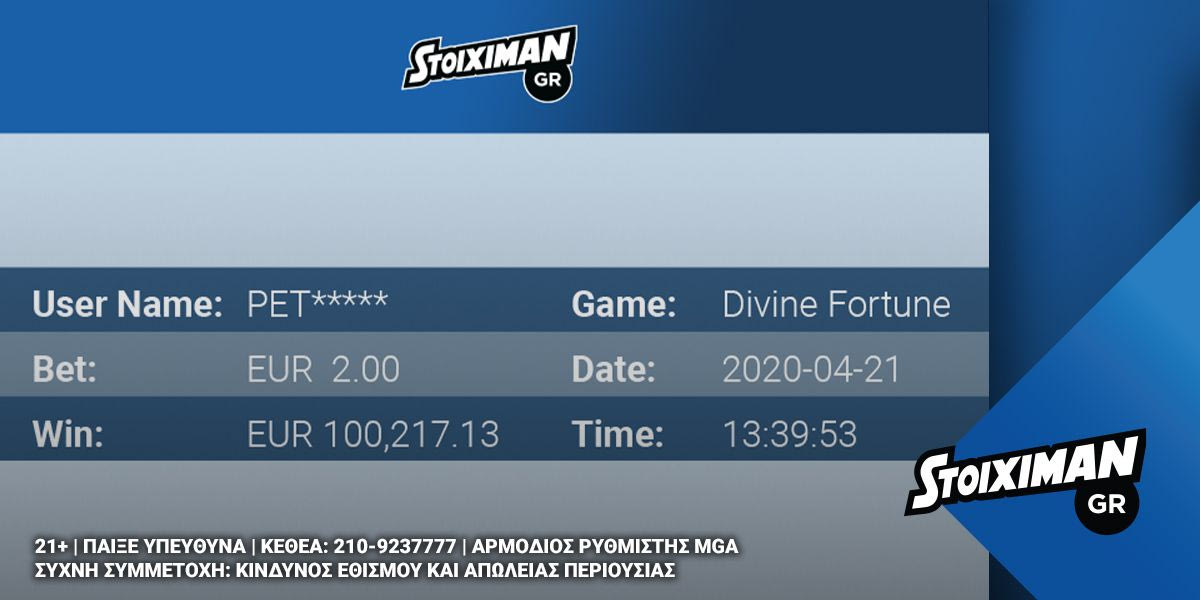 Λίγες μέρες μετά την επική νίκη ενός μέλους του Stoiximan.gr, το οποίο κέρδισε περισσότερα από 326.000€ στο Divine Fortune, ακόμα ένας υπερτυχερός είδε την τύχη να του χαμογελά πιάνοντας Jackpot στο ίδιο παιχνίδι.