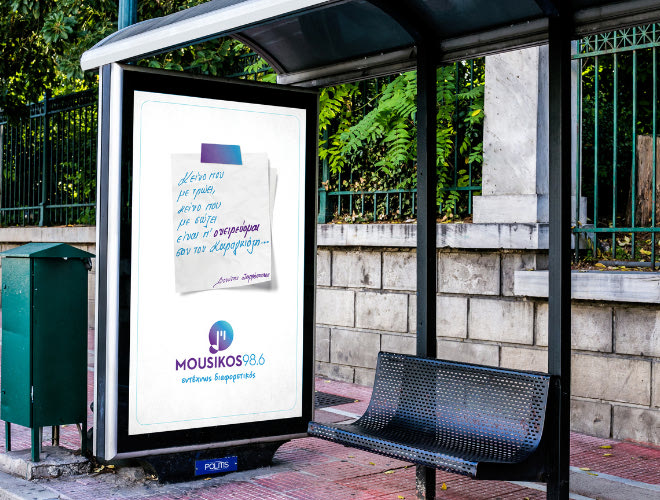 Η απάντηση στην περιέργειά μας ήρθε, και πάλι, καθώς περιμέναμε σε μία στάση λεωφορείου. Όπως αποκαλύφθηκε, λοιπόν, πίσω από την κίνηση αυτή, βρίσκεται ο ανανεωμένος Mousikos 98,6 και η νέα του καμπάνια.
