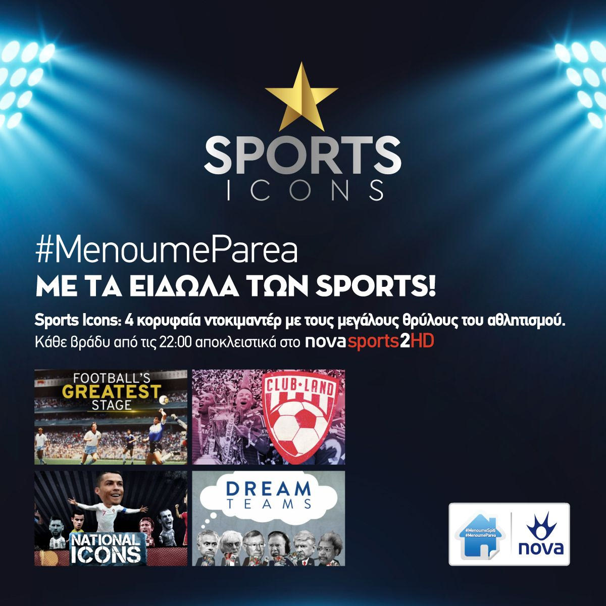 Τα κανάλια Novasports, τα κορυφαία αθλητικά κανάλια της χώρας, διαμορφώνουν το πρόγραμμά τους και τον Μάιο δημιουργώντας ζώνες αφιερωματικού χαρακτήρα προκειμένου να «Μένουμε Παρέα» με συναρπαστικές ιστορίες ποδοσφαίρου, μπάσκετ, αγώνες που έκριναν την μέχρι τώρα κατάταξη των πρωταθλημάτων και μια πλούσια συλλογή ντοκιμαντέρ μέσα από τη ζώνη Sports Icons.