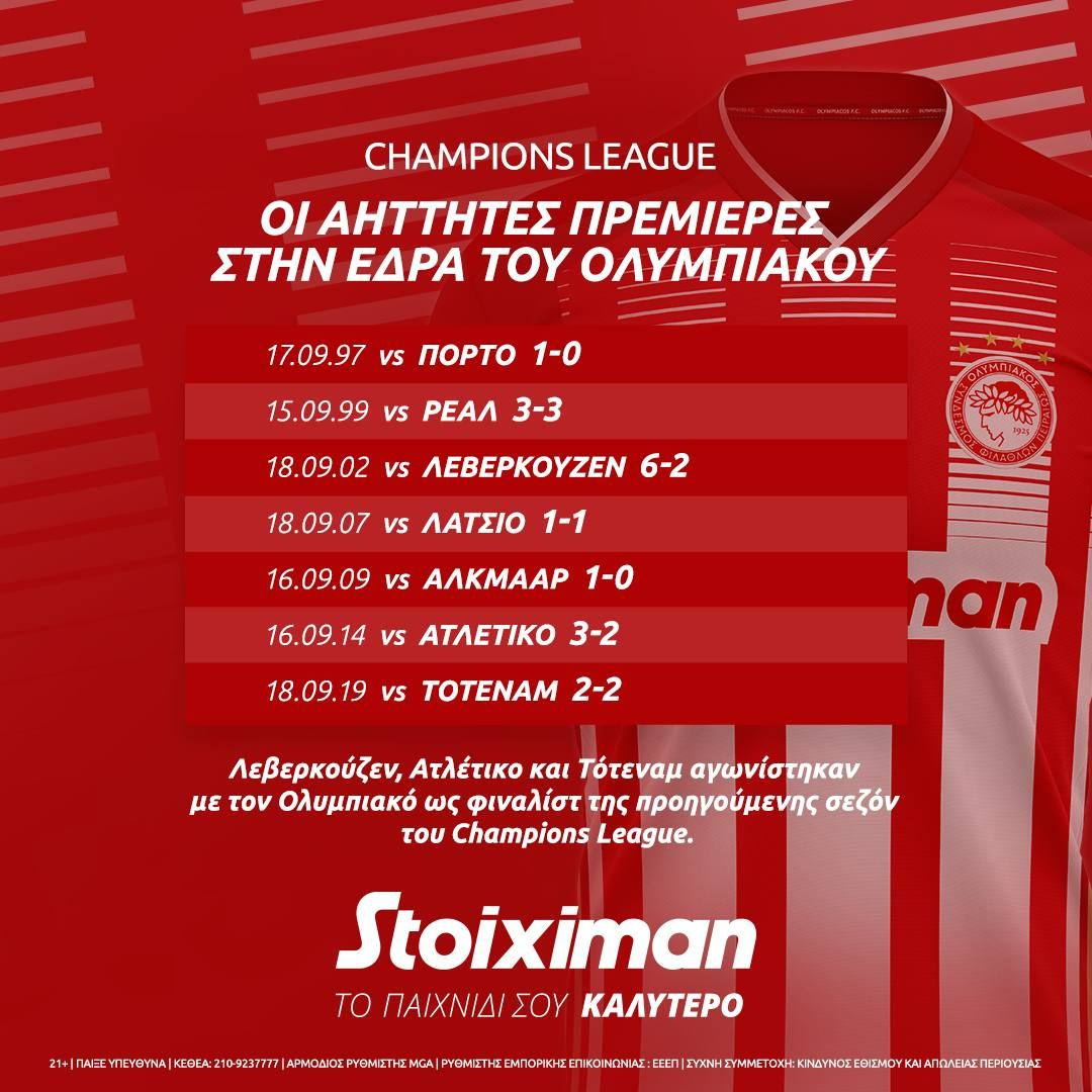 Για 8η φορά στην ιστορία του ο Ολυμπιακός θα κυνηγήσει το αήττητο σε πρεμιέρα Champions League στο σπίτι του. To έχει καταφέρει δύο φορές στο ΟΑΚΑ (απέναντι σε Πόρτο και Ρεάλ), μία φορά στη Ριζούπολη (Λεβερκούζεν) και τέσσερις στο Καραϊσκάκης (Λάτσιο, Αλκμάαρ, Ατλέτικο και Τότεναμ) στο οποίο υποδέχεται απόψε (22:00) την Μαρσέιγ.