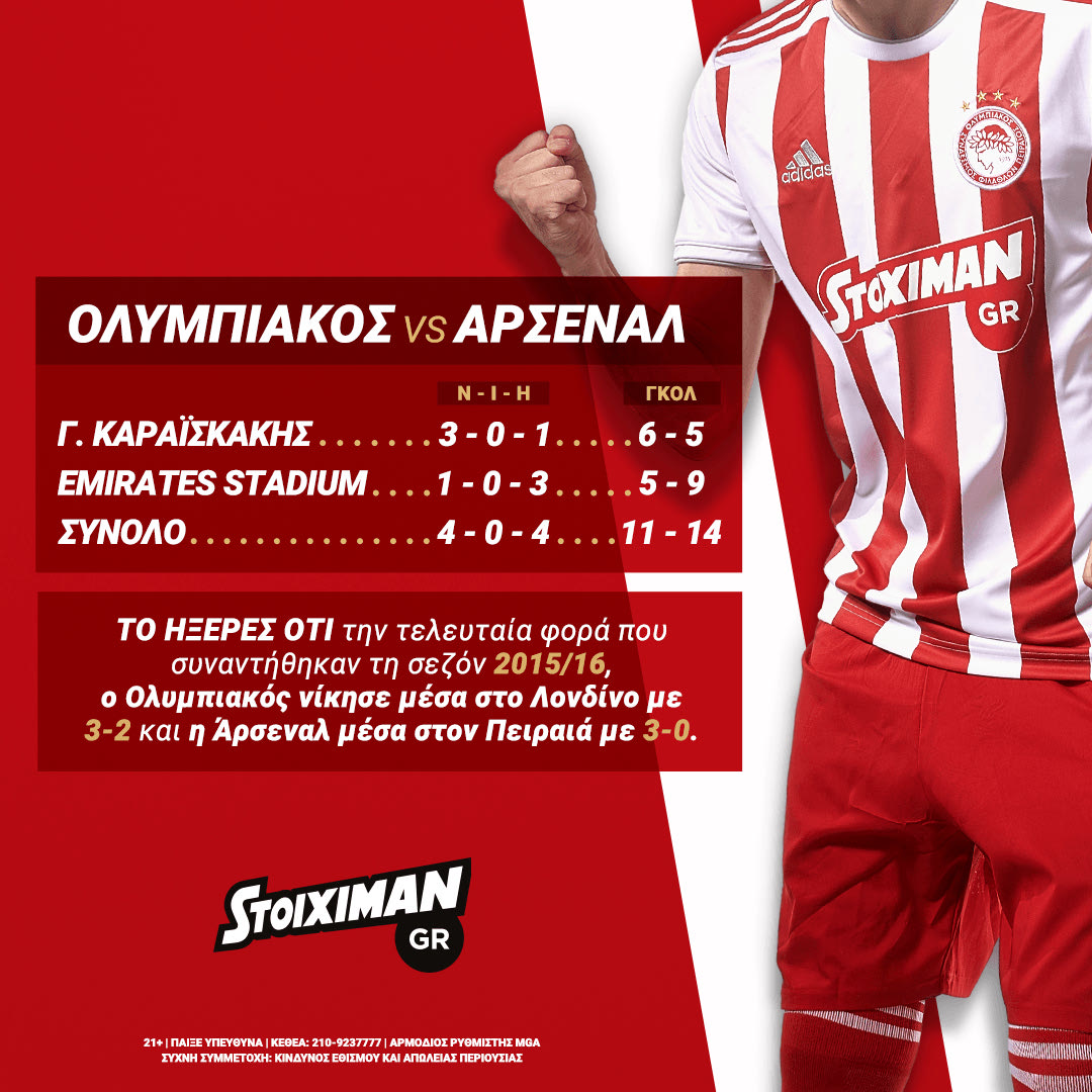 Θα είναι αυτό μία νίκη απέναντι στους κανονιέρηδες; Η παράδοση θέλει το συγκεκριμένο ζευγάρι χωρίς ισοπαλία στα προηγούμενα 8 παιχνίδια, όλα για το Champions League! Ο Ολυμπιακός έχει επικρατήσει 3 φορές στο Καραϊσκάκης και 1 στο Emirates, ενώ η Άρσεναλ 3 φορές στην Αγγλία και 1 στον Πειραιά.