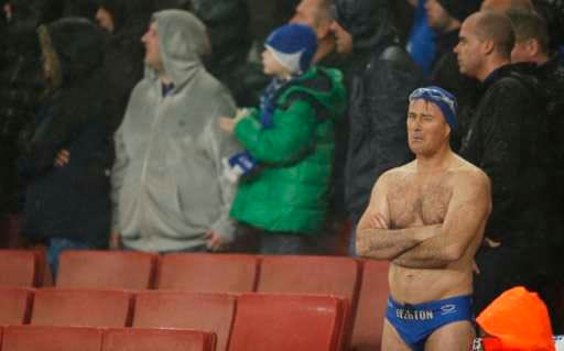 Football - Arsenal v Everton - Barclays Premier League - Emirates Stadium - 24/10/15 Everton fan wears swimming trunks Action Images via Reuters / John Sibley Livepic EDITORIAL USE ONLY. No use with unauthorized audio, video, data, fixture lists, club/league logos or "live" services. Online in-match use limited to 45 images, no video emulation. No use in betting, games or single club/league/player publications. Please contact your account representative for further details. REUTERS