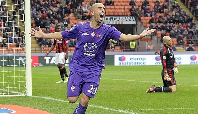 Fiorentina's Borja Iglesias Valero celebrates after scoring a second goal against AC Milan during their Italian Serie A soccer match at the San Siro stadium in Milan November 11, 2012. REUTERS/Alessandro Garofalo (ITALY - Tags: SPORT SOCCER) REUTERS