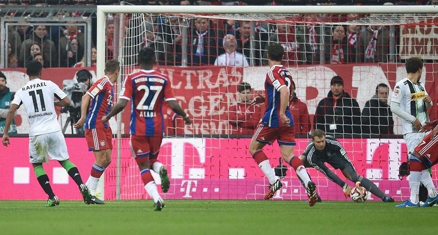 Σαν να μην έφτανε αυτό για τους γηπεδούχους, στο 30ό λεπτό ο Ραφαέλ χρίστηκε σκόρερ, εκμεταλλευόμενος λάθος αντίδραση του Μάνουελ Νόιερ. Η Μπάγερν είχε αποτύχει να σκοράρει σε εντός έδρας αγώνα μόλις μία φορά στα τελευταία 56 παιχνίδια πρωταθλήματος, ωστόσο η βραδιά δεν έμοιαζε με το μέρος της. Ο Ντάβιντ Αλάμπα τα είχε βρει σκούρα στην πτέρυγά του με τον Πάτρικ Χέρμαν, με συνέπεια ο Πεπ Γκουαρδιόλα να ρίξει στο παιχνίδι τον ανέτοιμο ακόμα για 90λεπτο Φίλιπ Λαμ. Ο αρχηγός της ομάδας δεν κατάφερα να βάλει τη “σφραγίδα” του εν αντιθέσει με τη συνεργασία Χέρμαν – Ραφαέλ, η οποία απέφερε ακόμα ένα γκολ για την Μπορούσια. Εάν δεν υπήρχε και ο Νόιερ στα τελευταία λεπτά και η επέμβασή του σε σουτ του Μαξ Κρούζε, καθώς και η αστοχία του Φάμπιαν Τζόνσον, η ήττα θα ήταν ακόμα πιο βαριά για τους γηπεδούχους, η πρώτη με διαφορά τουλάχιστον 2 γκολ σε αγώνα πριν εξασφαλίσουν μαθηματικά τον τίτλο από το 2011 και το 4-1 από την Ντόρτμουντ.
