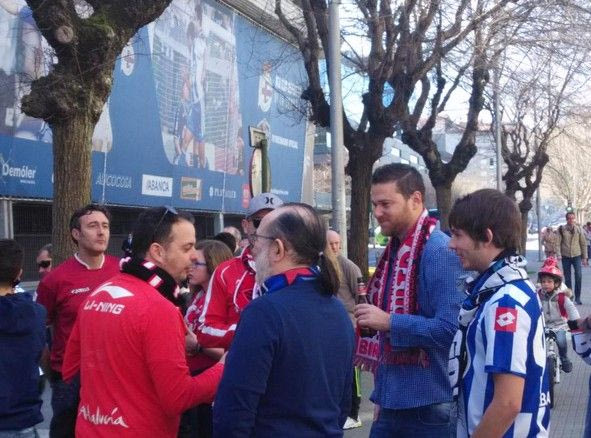 # Φίλαθλοι της Λα Κορούνια και της Σεβίλλης μαζί πριν από τη σέντρα στο “Ριαθόρ”.