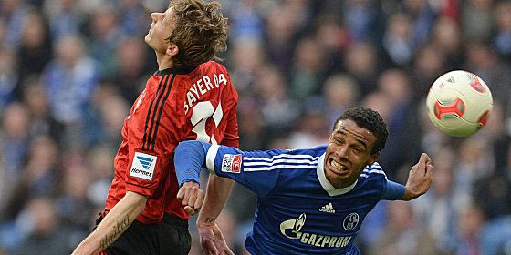 Leverkusen's striker Stefan Kiessling (L) and Schalke's Cameroonian defender Joel Matip vie for the ball during the German first division Bundesliga football match FC Schalke 04 vs Bayer Leverkusen in the German city of Gelsenkirchen on April 13, 2013. AFP PHOTO / PATRIK STOLLARZ DFL RULES TO LIMIT THE ONLY USAGE DURING MATCH TIME TO 15 PICTURES PER MATCH. IMAGE SEQUENCES TO SIMULATE VIDEO IS NOT ALLOWED AT ANY TIME. FOR FURTHER QUERIES PLEASE CONTACT DFL DIRECTLY AT + 49 69 650050. (Photo credit should read PATRIK STOLLARZ/AFP/Getty Images) AFP/Getty Images