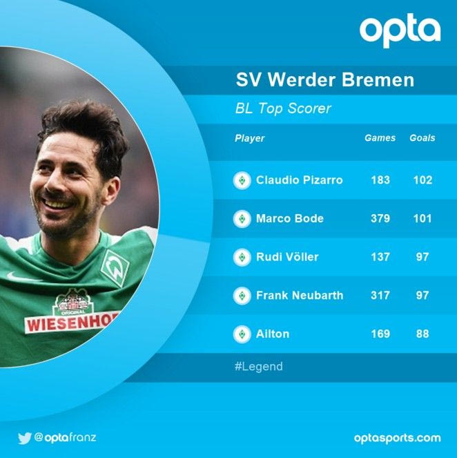 Ο Κλάουντιο Πισάρο χρειαζόταν ένα γκολ για να γράψει ιστορία. Η φόρμα του έδειχνε ότι θα το πετύχαινε, αφού είχε 13 στα τελευταία 12 παιχνίδια για τη Βέρντερ. Το ρεκόρ καταρρίφθηκε και με αυτό έμελε να ολοκληρωθεί μία άκρως αποτυχημένη χρονιά για τη Βόλφσμπουργκ, την περσινή δεύτερη καλύτερη ομάδα της χώρας. Η ομάδα της Βρέμης νίκησε με 3-2, απομακρύνθηκε από τη ζώνη του άμεσου υποβιβασμού και ταυτόχρονα ο 37χρονος Περουβιανός επιθετικός έφτασε τα 102 γκολ στη Bundesliga με τη φανέλα της, καταρρίπτοντας το ρεκόρ του Μάρκο Μπόντε από το 1989 μέχρι το 2002. Το ρεκόρ θα μπορούσε να είχε καταρριφθεί από νωρίς, όταν ο Φάμπιαν Μπάρτελς είχε δοκάρι και στην επαναφορά ο Πισάρο δεν κατάφερε να ανοίξει το σκορ. Εν τέλει το έκανε στο 32′ σε πέναλτι που κέρδισε ο Ζλάτκο Γιουνούζοβιτς από τον Βιεϊρίνια.