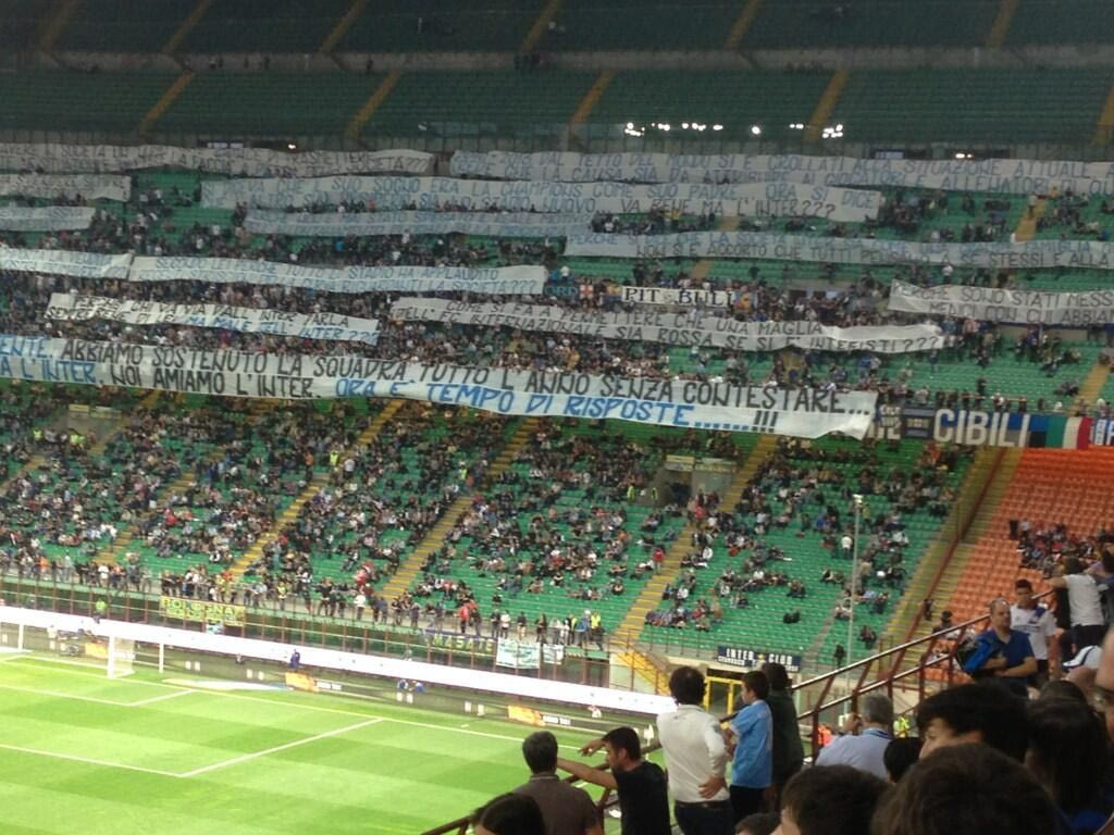 # Ούτε ένα, ούτε δύο, αλλά 12 πανό διαμαρτυρίας διακρίνονται στη φωτογραφία από απηυδισμένους φίλους της Ίντερ για τη φετινή κάκιστη σεζόν των “νερατζούρι”. Ένα πανό και μία ερώτηση προς τη διοίκηση του συλλόγου. Οι φίλαθλοι, οι οποίοι στα πρώτα 5 λεπτά δεν ακούστηκαν ως ένδειξη διαμαρτυρίας και στη συνέχεια δεν σταμάτησαν να τραγουδούν ούτε λεπτό, σημειώνουν ότι όλη τη σεζόν στήριξαν την ομάδα, όπως τους είχε ζητηθεί, και τώρα ζητούν απαντήσεις.