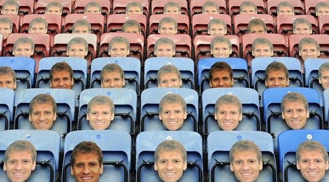 # Μάσκες με το πρόσωπο του άσου της Άστον Βίλα, Στιλιάν Πετρόφ, ο οποίος δίνει μάχη με τη λευχαιμία και εγκατέλειψε το ποδόσφαιρο τη φετινή σεζόν, εμφανίστηκαν στις καρέκλες του γηπέδου της Γουίγκαν, “JJB”, πριν από το παιχνίδι των 2 ομάδων.