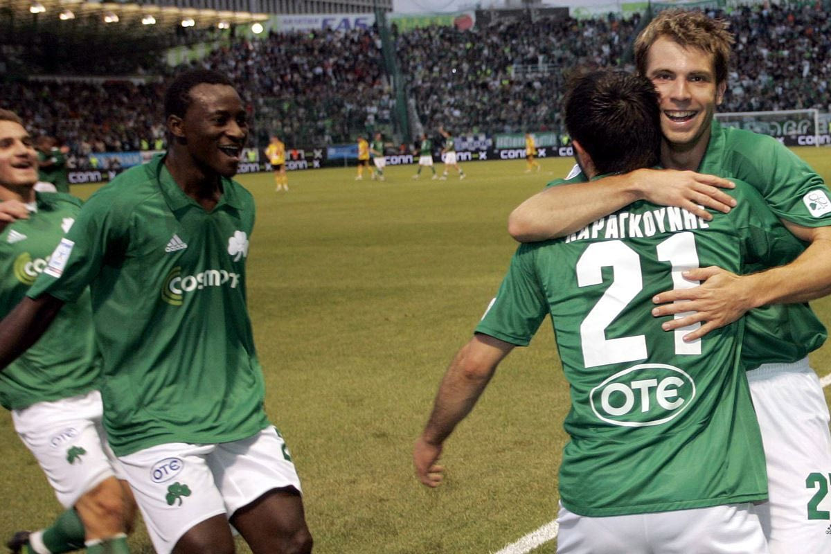 Ο Γιώργος Καραγκούνης του Παναθηναϊκού πανηγυρίζει με τον Αντρέας Ίβανσιτς και τον Νταμ Εντόι γκολ που σημείωσε κόντρα στον Άρη για τα playoffs της Super League 2007-2008 στο 'Απόστολος Νικολαΐδης' | Κυριακή 11 Μαΐου 2008 Eurokinissi Sports/Στάμος Σιαφάκας