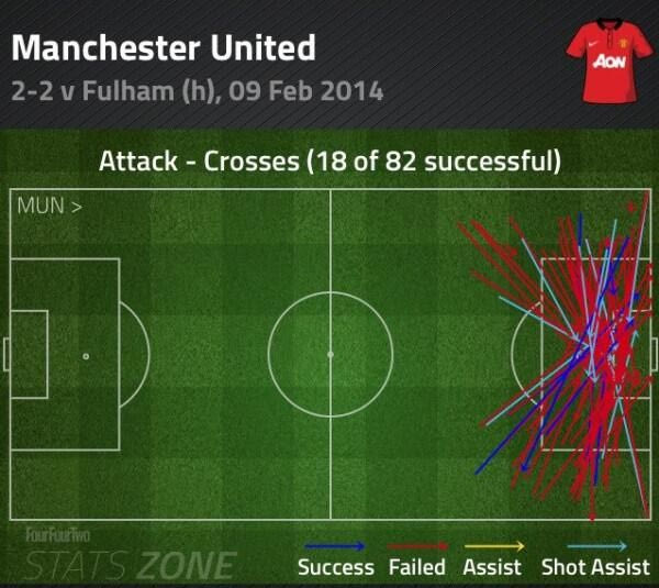 H Γιουνάιτεντ του Μόγες αποδεικνύει -και βάσει αριθμών- ότι προσπαθεί να παίξει ποδόσφαιρο περασμένων δεκαετιών, με γιόμες και σέντρες από όλα τα μήκη και πλάτη του γηπέδου. Αποτέλεσμα; Δύο γκολ μετά από πολλή προσπάθεια, απογοήτευση, γκρίνια και διαμαρτυρίες στην εξέδρα. Την ίδια ώρα η Φούλαμ που κατάφερε να “κλέψει” τον βαθμό στο τέλος, επιχείρησε μόλις 4 σέντρες σε ολόκληρο το παιχνίδι.
