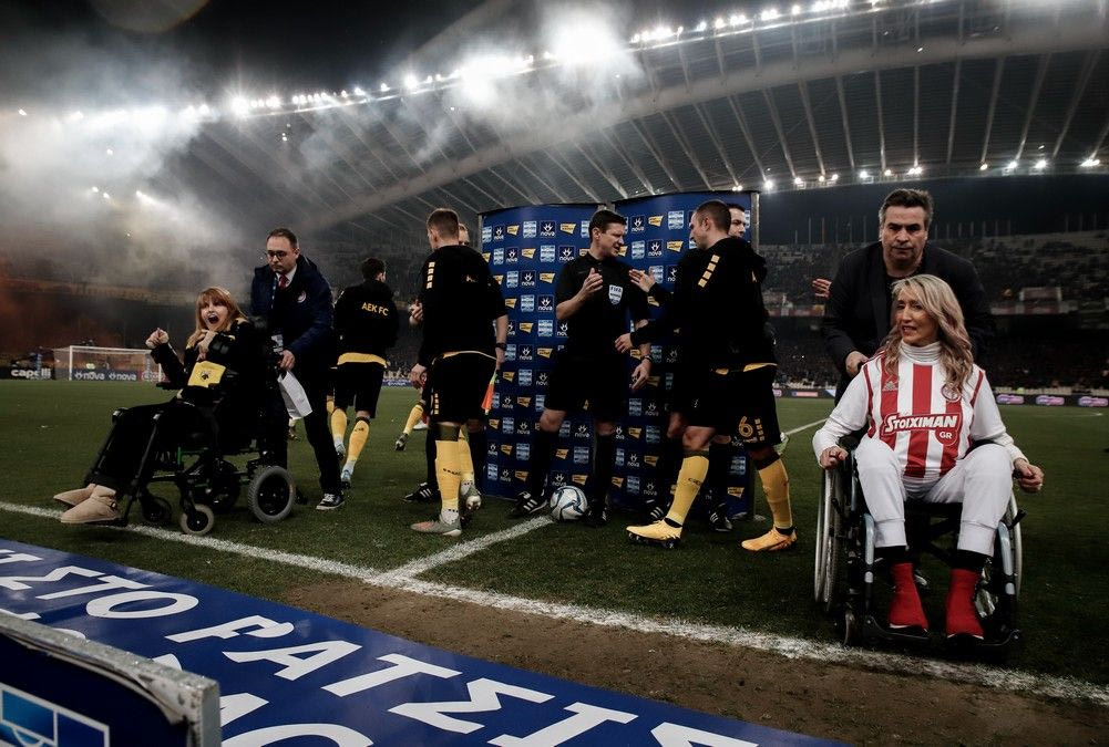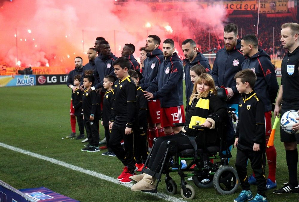 Η Μυρτώ Παπαδομιχελάκη, η νεαρή φίλαθλος της Ένωσης, που το 2012 είδε τη ζωή της να παίρνει φρικτή τροπή, βρέθηκε ξανά στο Ολυμπιακό Στάδιο για να στηρίξει την ομάδα της. Αυτήν τη φορά, όμως, είχε διττό ρόλο, αφού ήταν και οικοδέσπινα της Τόνιας, μιας γνωστής φιλάθλου του Ολυμπιακού, η οποία αντιμετωπίζει κινητικά προβλήματα. Οι ρόλοι ήταν αντίστροφοι στο ντέρμπι του 1ου γύρου (πρωτοβουλία που τιμήθηκε στα βραβεία ΠΣΑΤ) και τώρα ήρθε η ώρα της ευγενικής ανταπόδοσης, σε μια αξιομνημόνευτη κίνηση από όλες τις πλευρές.