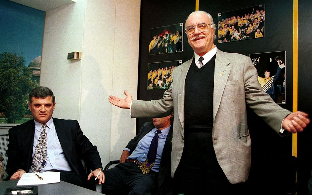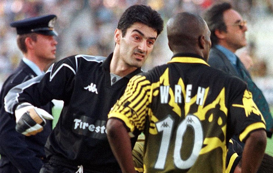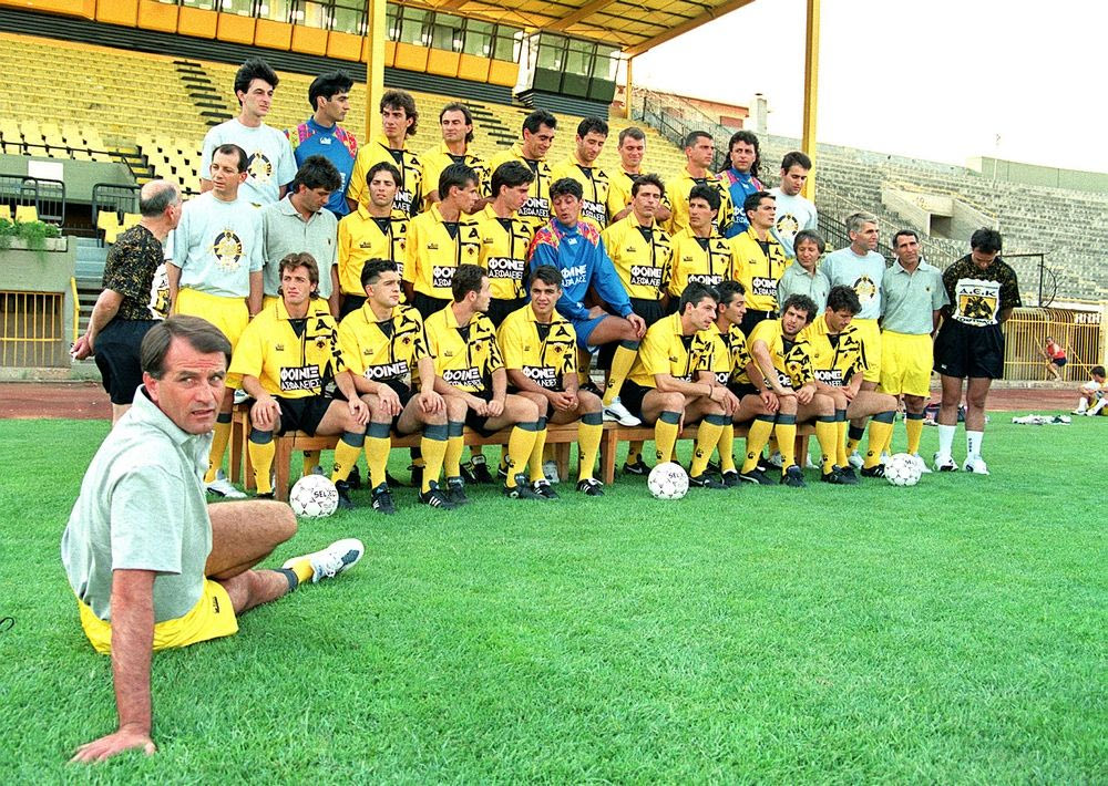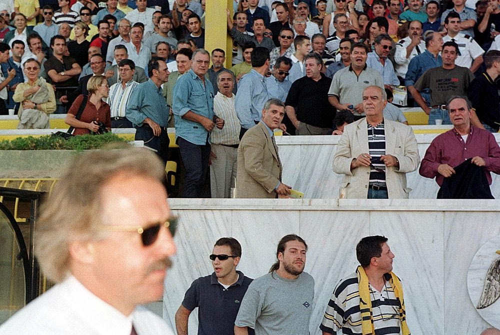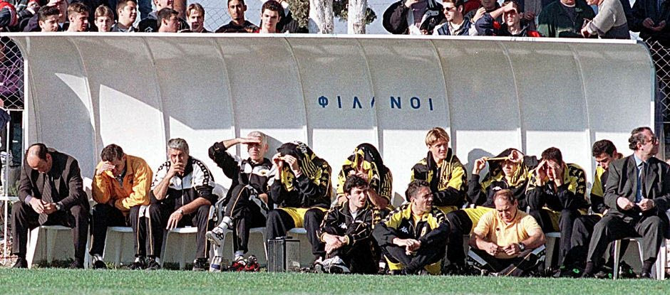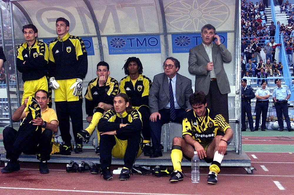 18. Ο πάγκος στα τέλη 90s. Ο Δημήτρης Μελισσανίδης με το κινητό, η συγκέντρωση του Νίκου Στράτου, η αγωνία του… τεράστιου Μπόμπαν Μπαμπούνσκι αριστερά. Epic!