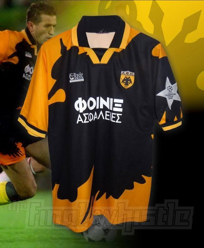 38. H καλύτερη φανέλα της Ευρώπης τη σεζόν 1994-95. Ίσως και η καλύτερη φανέλα, γενικά… H εντυπωσιακή εμφάνιση της Basic με την οποία η ΑΕΚ έπαιξε στους ομίλους του Τσάμπιονς Λιγκ ως η πρώτη ελληνική ομάδα που κατάφερε κάτι τέτοιο. Η παρακάτω, είναι φορεμένη από τον Ρέφικ Σαμπανάτζοβιτς και ανήκει στη μεγάλη συλλογή του Final Whistle.