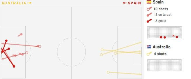 Οι Αυστραλοί, χωρίς Κέιχιλ και Μπρεσιάνο στο γήπεδο, δεν μπορούσαν να κρατήσουν και να προωθήσουν την μπάλα όντες κυρίως σε θέση άμυνας. Υπό αυτές τις συνθήκες ήταν δύσκολο ν’ αντέξουν στην πίεση της Ισπανίας και το 1-0 από το απίθανο τακουνάκι του Βίγια στο 36′, μετά τη συνεργασία Ινιέστα-Χουανφράν, ήρθε ως φυσική εξέλιξη των όσων συνέβησαν στο πρώτο μισό.