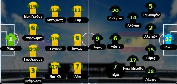 Η βελτιωμένη εικόνα των “καγκουρό” που κέρδισαν μέτρα στο γήπεδο και πάτησαν την περιοχή του Ρέινα δεν είχε χειροπιαστό αποτέλεσμα. Το σουτ του ΜακΚέι στο 59′ ήταν ό,τι απειλητικότερο έφτιαξαν οι Αυστραλοί σ’ ένα παιχνίδι που οι Ίβηρες ήταν το αφεντικό παίζοντας στρωτά στο κέντρο. Εξ ου και το 2-0 στο 69′ μετά την κάθεση του Ινιέστα και το πλασέ του Τόρες.