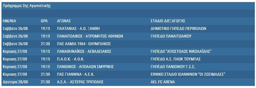 Η Super League οριστικοποίησε τις ημέρες και τις ώρες που θα γίνουν οι αγώνες την 1η και την 2η αγωνιστική του πρωταθλήματος. Στην πρεμιέρα του Σαββάτου 19/8 παίζει ο Ολυμπιακός στις 21:30 με την ΑΕΛ στο “Καραϊσκάκη”, ενώ οι άλλοι τρεις από τους “Big 4” μπαίνουν στη μάχη από την Κυριακή (20/8).
